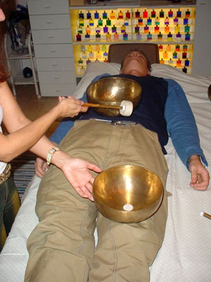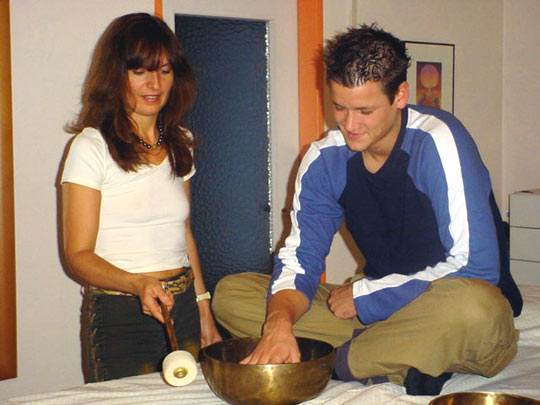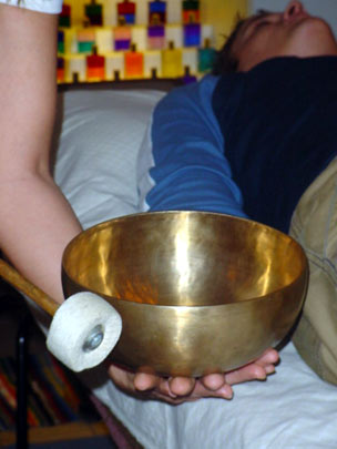 den sanften Druck aufgelegter Klangschalen, die sanft angeschlagen